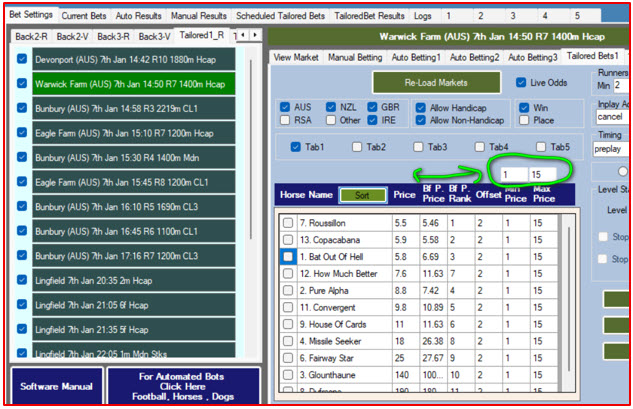 As the name suggests you tailor the selections that you want, and the schedule the bet to be placed. Now you can restrictions, like the favourite must be a certain odds or better, and also what odds range the selections must be the default is 3.00 to 100 however you can change this on individual horses and even individual races. The set up for the tailored option, is the same as Auto, except for the selection method. In Tailor bets side, user can use upto 2 strategies having each one of them having different settings.