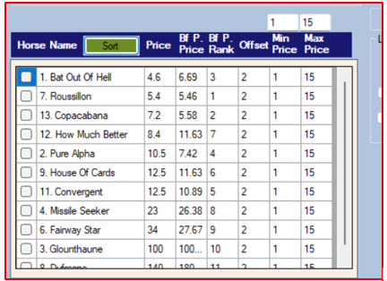 You set the favourites ranking that you would like the mini bot to bet on. You set the minimum and maximum odds you will accept, if betting more than one selection, and one horse is outside of the odds range then only the horse or horses that match the odds ranges will be bet. Also if the Fav Minimum odds has been set then if the favourite is below the odds set, NO bets will be placed on that race. As the Minimum Fav odds if set over rides all settings.