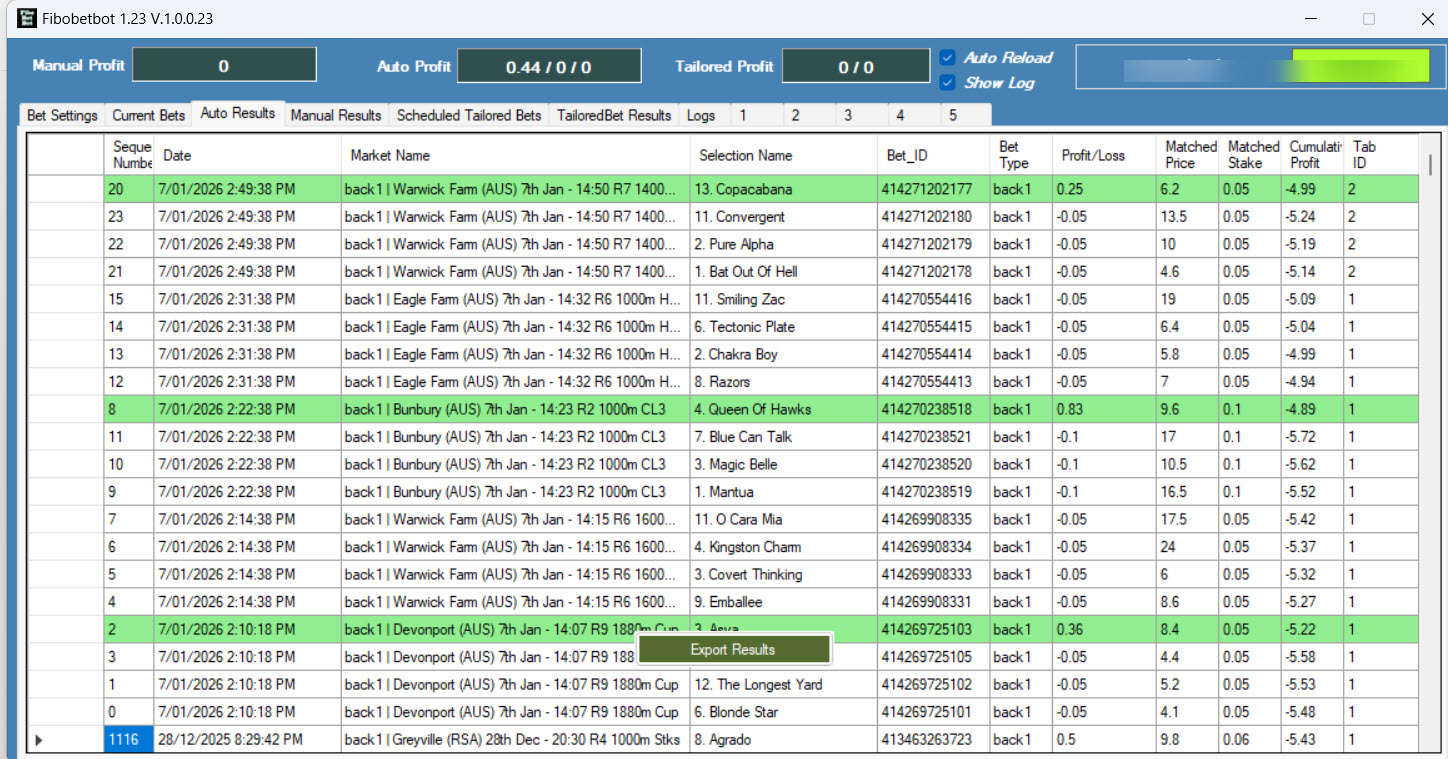 Thanks for purchasing the FiboBetBot Latest Version released 10/1/2026 Version 1.25 Additions are: In Auto Betting option to bet only qualified horses even if some dont meet criteria. Drop back after winner now option of dropping more that 2 sequences. Start at a higher place in the sequence, eg instead of starting at 1, you can start at 2,3, or 5 in Auto Mode.